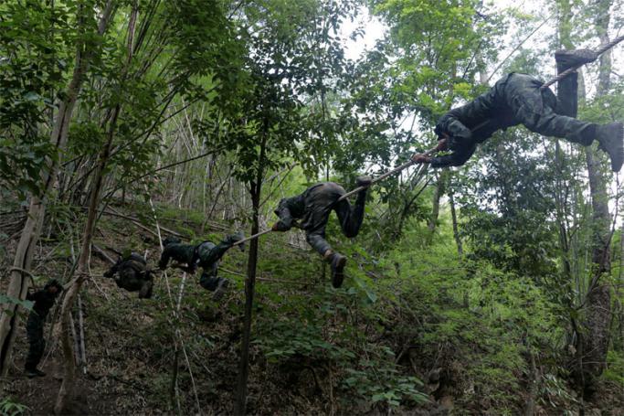 Volunteers are trained in jungle tactics -- crossing muddy streams by shimmying along a rope, taking cover in the undergrowth and carrying injured comrades to safety.