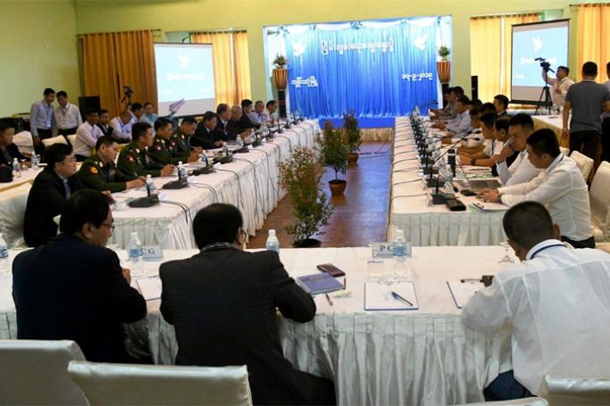 A meeting between the National Reconciliation and Peace Center (NRPC) and representatives of the four ethnic armed groups KIO, MNTJP, PSLF and ULA takes place in Kengtung, Shan State. Photo: MNA