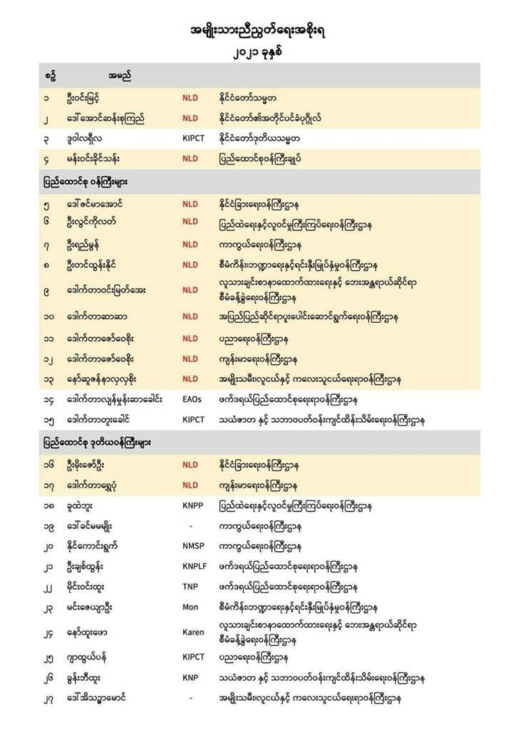 Surprisingly, positions of President Win Myint and State Counselor Aung San Suu Kyi are maintained in the new government line up even though they are detained and charged by the junta government, begging the question on how they would be able to function at all, not to mention to participate effectively.
