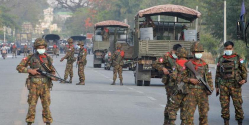 Photo: Myanmar soldiers stand guard on a road amid demonstrations against the military coup in Naypyidaw on February 17, 2021. STR / AFP