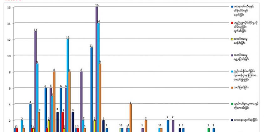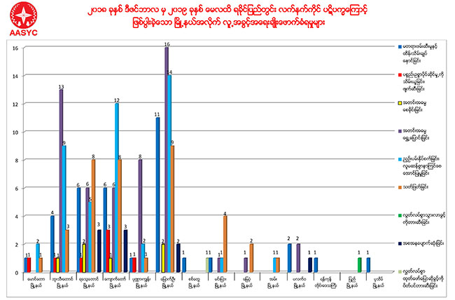 The area with the highest number of abuses was Mrauk-U in Rakhine State. Other townships, including Maungdaw, Buthidaung, Rathedaung, Kyauktaw, Ponnagyun, Minbya, Sittwe, Myaepon, and Ann in Rakhine State and Paletwa in Chin State, also recorded numerous abuses, according to the report. Several cases related to the conflict were also recorded in Pyi, Pathein and Yangon.