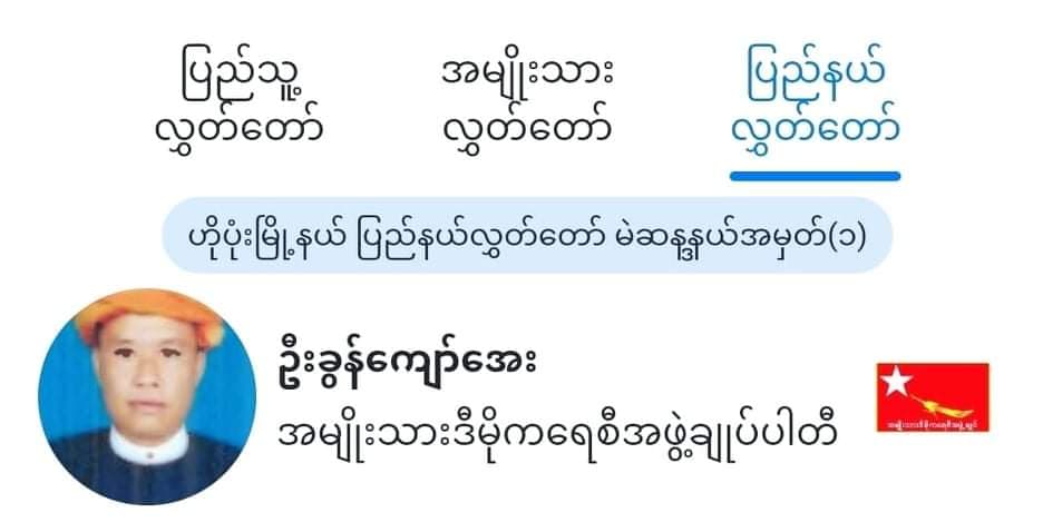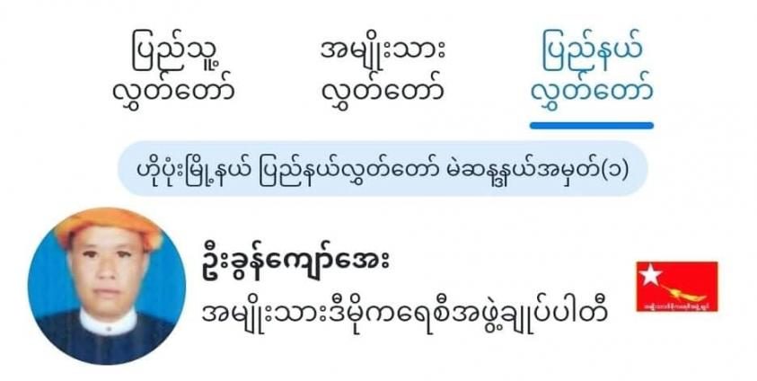 According to an eyewitness, Khun Kyaw Aye was detained in Hpton town at 10pm on Monday, May 3, three days after his wife was sent home. It is suspected an informer told the military the MP was visiting.