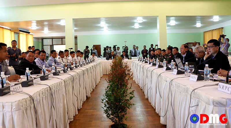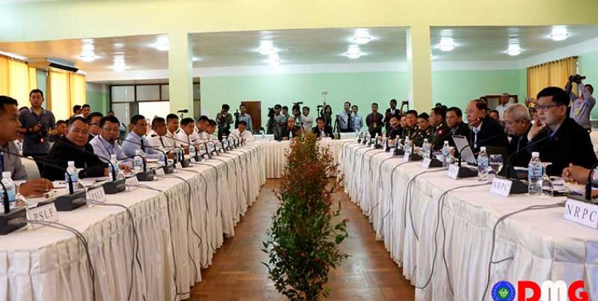 Photo Caption: Tatmadaw representatives and members of the National Reconciliation and Peace Centre and Northern Alliance hold talks in September 2019 in Kengtung, Shan State.