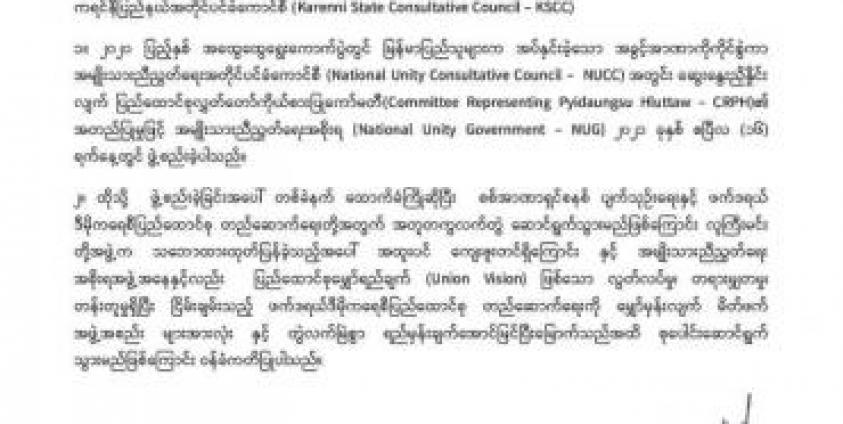 The National Unity Government (NUG) has also pledged to collectively work to achieve the goal of building up a peaceful federal democratic union with the Karenni State Consultative Council (KSCC).