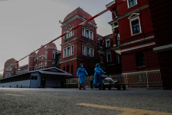 Staff members push a food trolley to deliver breakfast at the Yangon General Hospital, in Yangon, Myanmar, 24 January 2021. Photo: EPA