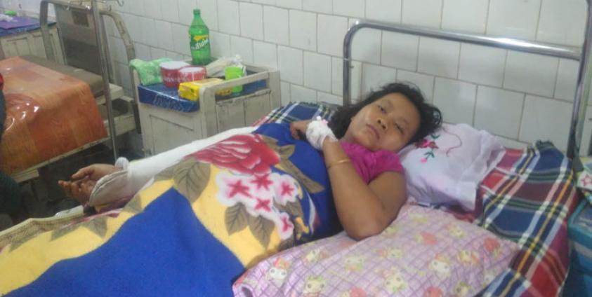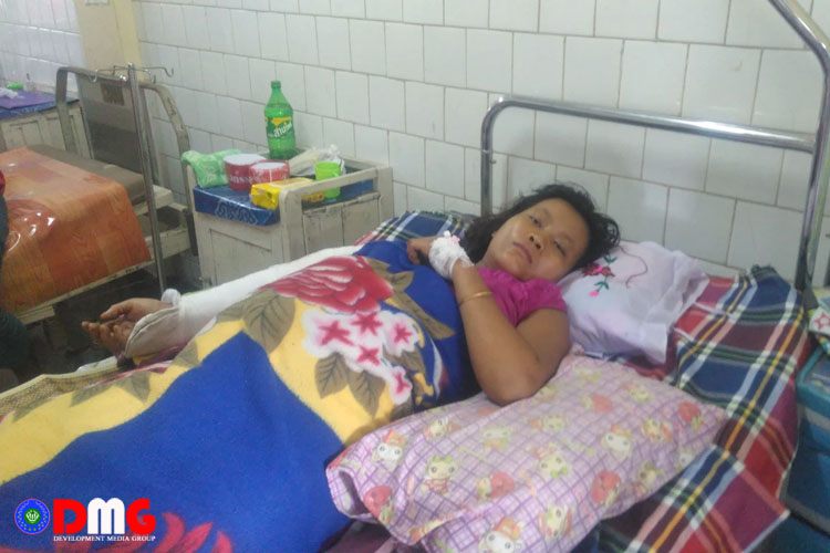 Daw Aye Aye Myint was injured in her right arm and sent to Sittwe hospital yesterday, said her husband Ko Zaw Zaw.