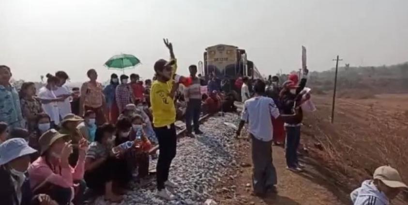 A Mawlamyine-Yangon passenger train went back to Mawlamyine Station as the protestors blocked the railroad on the morning of February 16th.