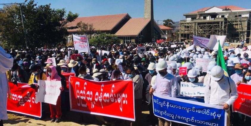 For the third day in a row, over 2,500 demonstrated in the town of Falam yesterday. More than 40 teachers and staff from Longpee Agricultural School joined the protest to condemn the Tatmadaw's coup on February 1.