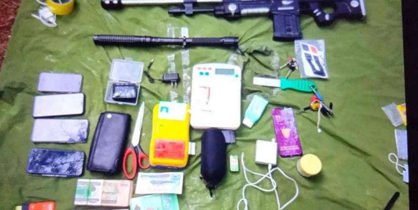 A point-22 gun, an air gun, a hitting rod, a sword, A kilo scale used to weigh drugs, four phones, 14-lakh Myanmar Kyats in cash and items related to drug use were seized after Zaw Win Shin's home was searched, Launglon PDF announced.
