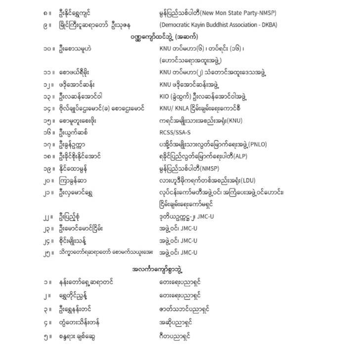 The military council also awarded the title of Wunna Kyaw Htin to the leaders of the ethnic armed organizations as well as to 25 leaders from ethnic special regions, Peace Commission and the Union-level Joint Ceasefire Monitoring Committee.