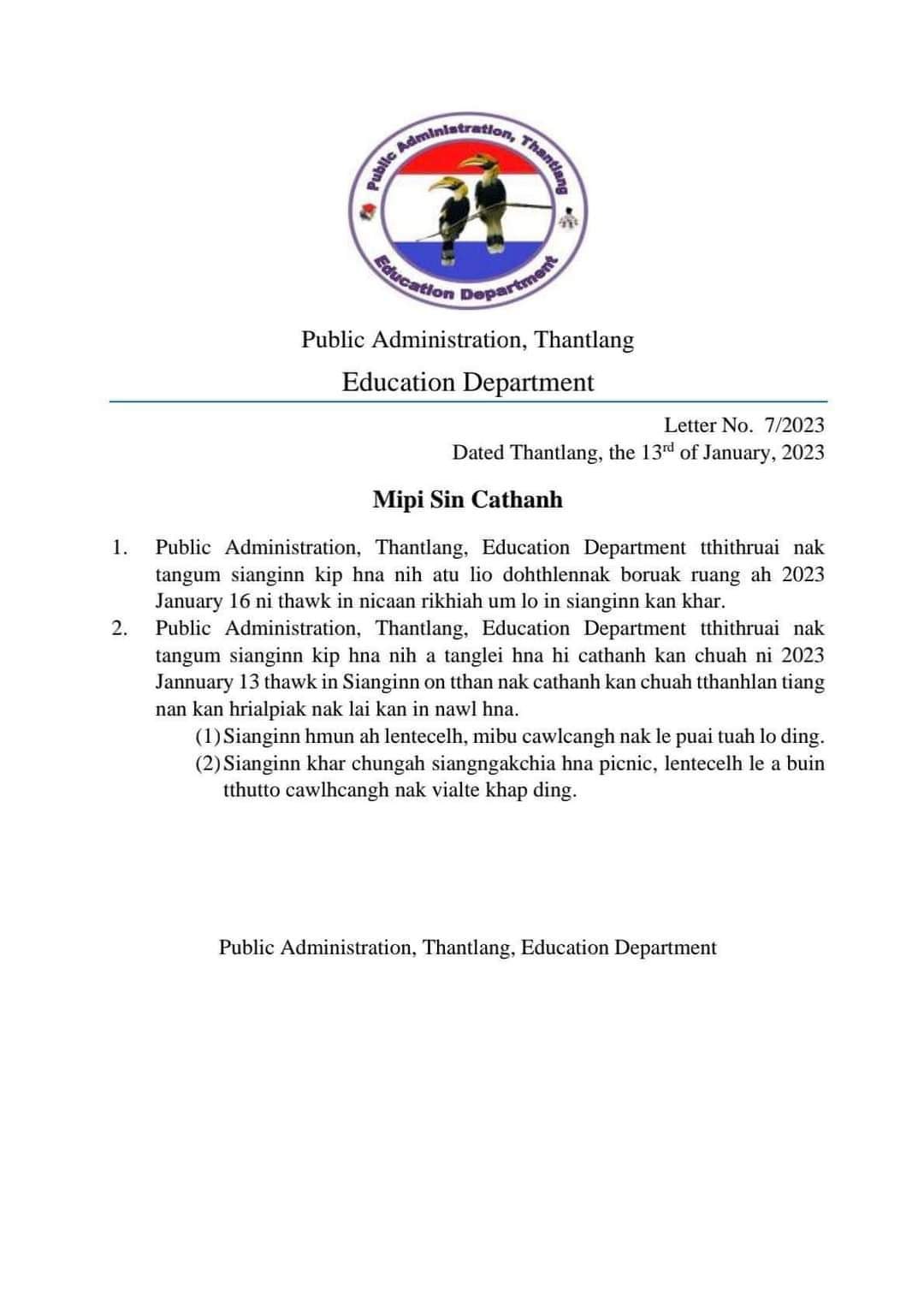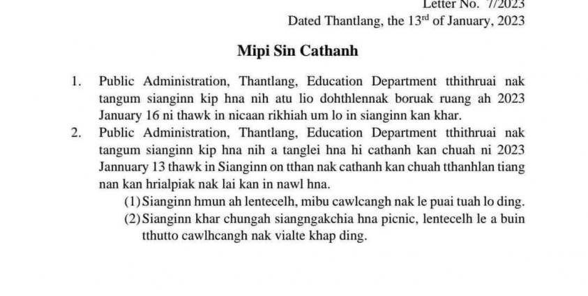 The Public Administration, Thantlang Education Department has also warned people not to play, have picnics, or live in crowded places in the school area during the time when schools are closed.