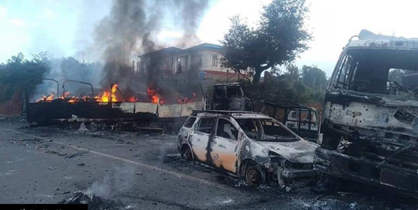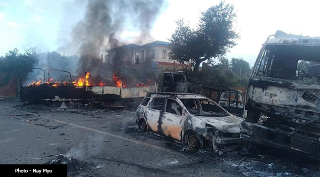 “The drivers and passengers told us the vehicles were lined up in a row on the Kutkai-Muse highway between Nam Kut and Nawng Swe. Then the ethnic armed forces set them on fire on the road,” Mine Mai, the spokesperson for the Humanitarian Strategic Team—Northern Shan State (HST-NSS), told NMG.