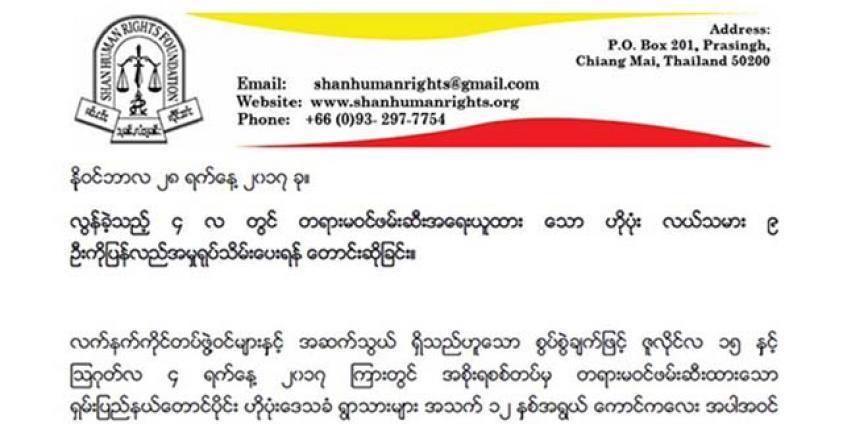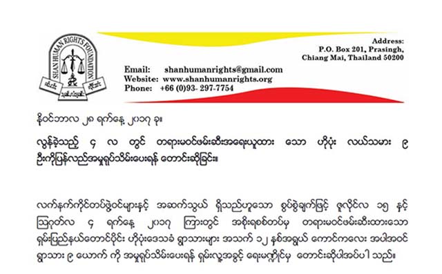 The Shan Human Rights Foundation (SHRF) is demanding the Tatmadaw release nine residents of Hopong township, including a 12-year-old boy, all of whom it claims were wrongfully arrested and are being unfairly persecuted.