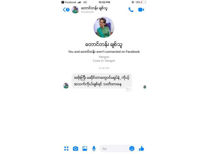 The night before the abbot was killed, Shan human rights activists said they received threats from the account of a Facebook user named Tawng Tan Chit Thu, whose page features a profile picture of State Counsellor Aung San Suu Kyi.