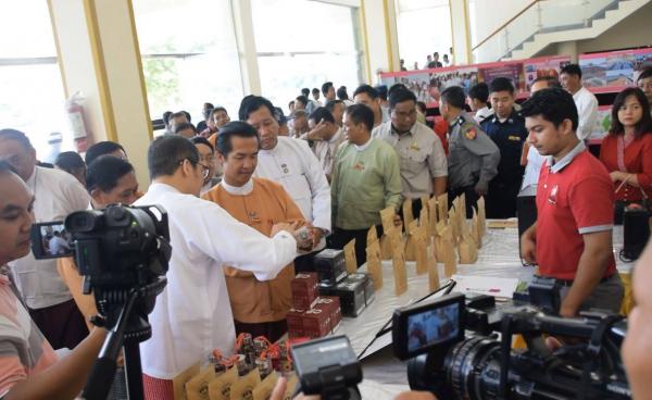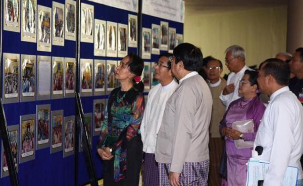 State Counsellor Daw Aung San Suu Kyi, former President U Htin Kyaw and wife, and dignitaries looking at documentary photos on activities of...