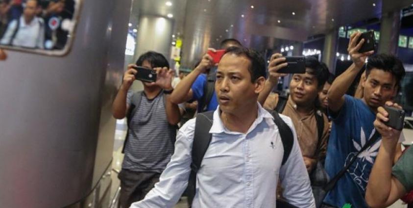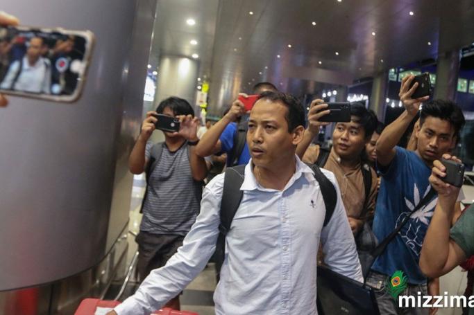 One of six leaders of the Arakan Association who arrested in Singapore arrives back at Yangon International Airport in Yangon on July 10, 2019. Photo: Thura/Mizzima