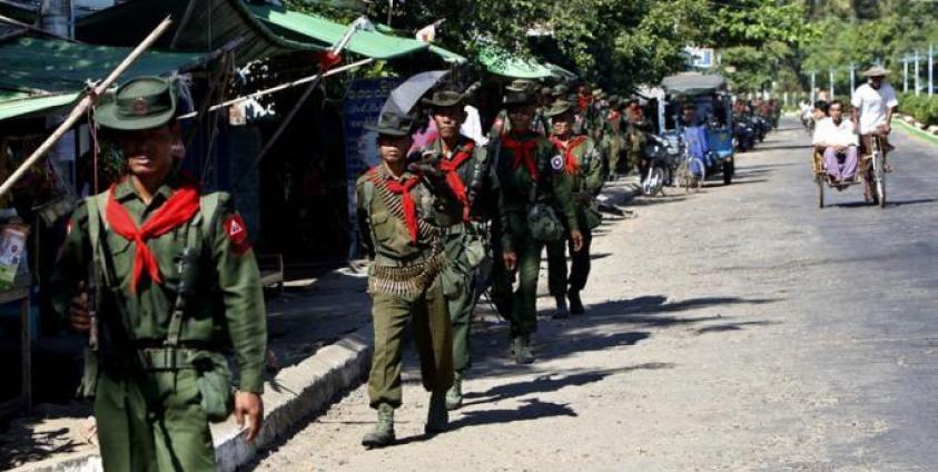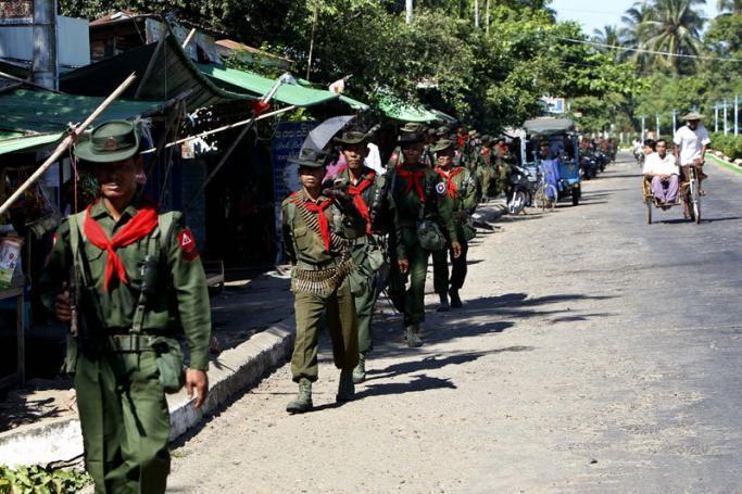 (File) Myanmar soldiers, arriving back from the unrest area in Rakhine state, march in Sittwe city, capital of Rakhine State, Myanmar. Photo: Nyein Chan Naing/EPA