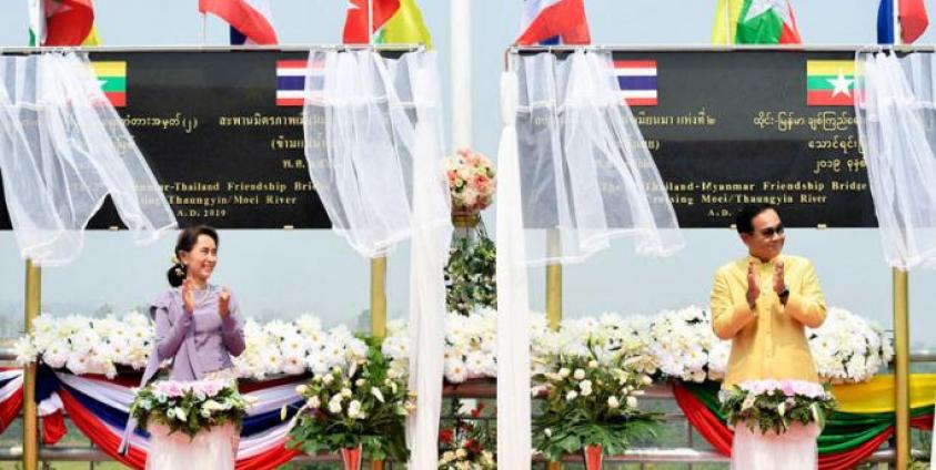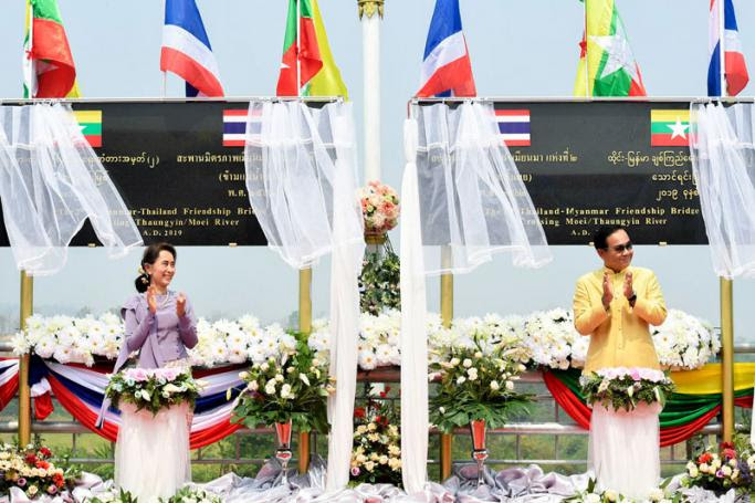 Thai Prime Minister Prayut Chan-o-cha (R) and Myanmar's state counselor Aung San Suu Kyi (L) clapping during an event to mark the completion of the second Thailand-Myanmar Friendship Bridge in the Thai-Myanmar border city of Mae Sot, Tak province, Thailand, 19 March 2019. Photo: Royal Thai Government/EPA