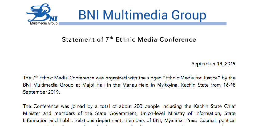 The 7th Ethnic Media Conference was organized with the slogan “Ethnic Media for Justice” by the BNI Multimedia Group at Majoi Hall in the Manau field in Myitkyina, Kachin State from 16-18 September 2019.