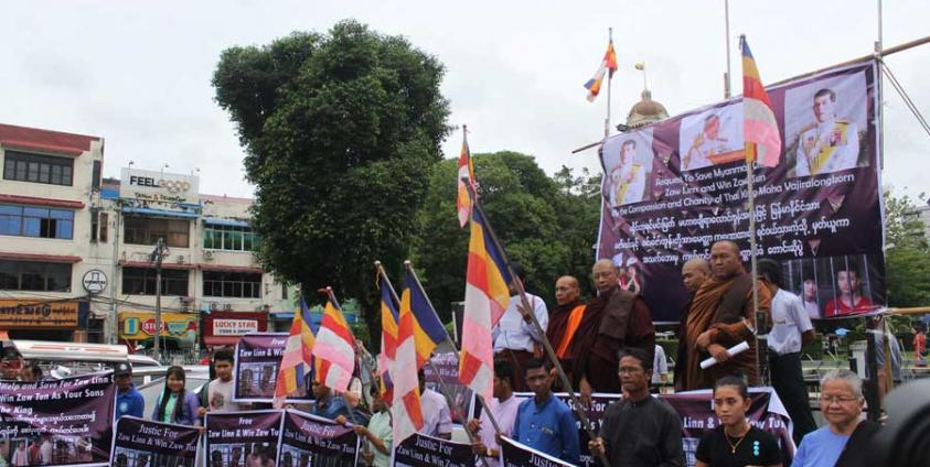 Supporters of two Myanmar migrant workers who have been sentenced to death in Thailand gathered in front of Maha Bandula Park in Yangon on 2 September. They have sent an appeal to the Thai King requesting a royal pardon.