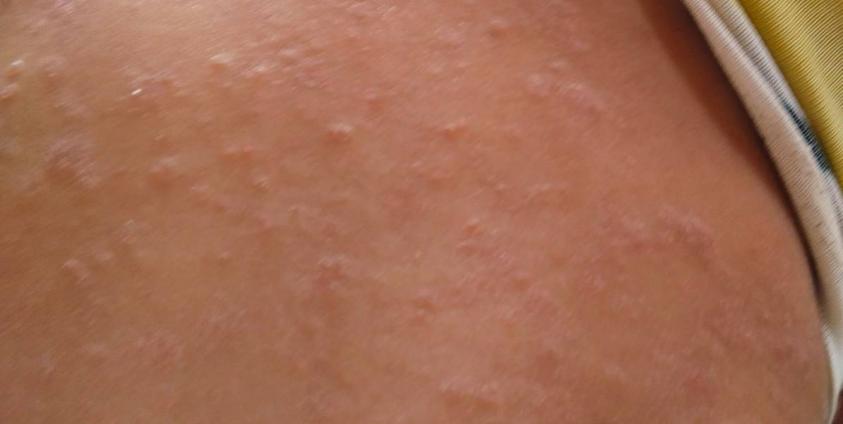 Symptoms include itching all over the body, red rashes on the legs, fluid-filled blisters, swelling, and inflammation. The clinic reports seeing at least 10 cases daily, with over 160 cases documented in a single month.