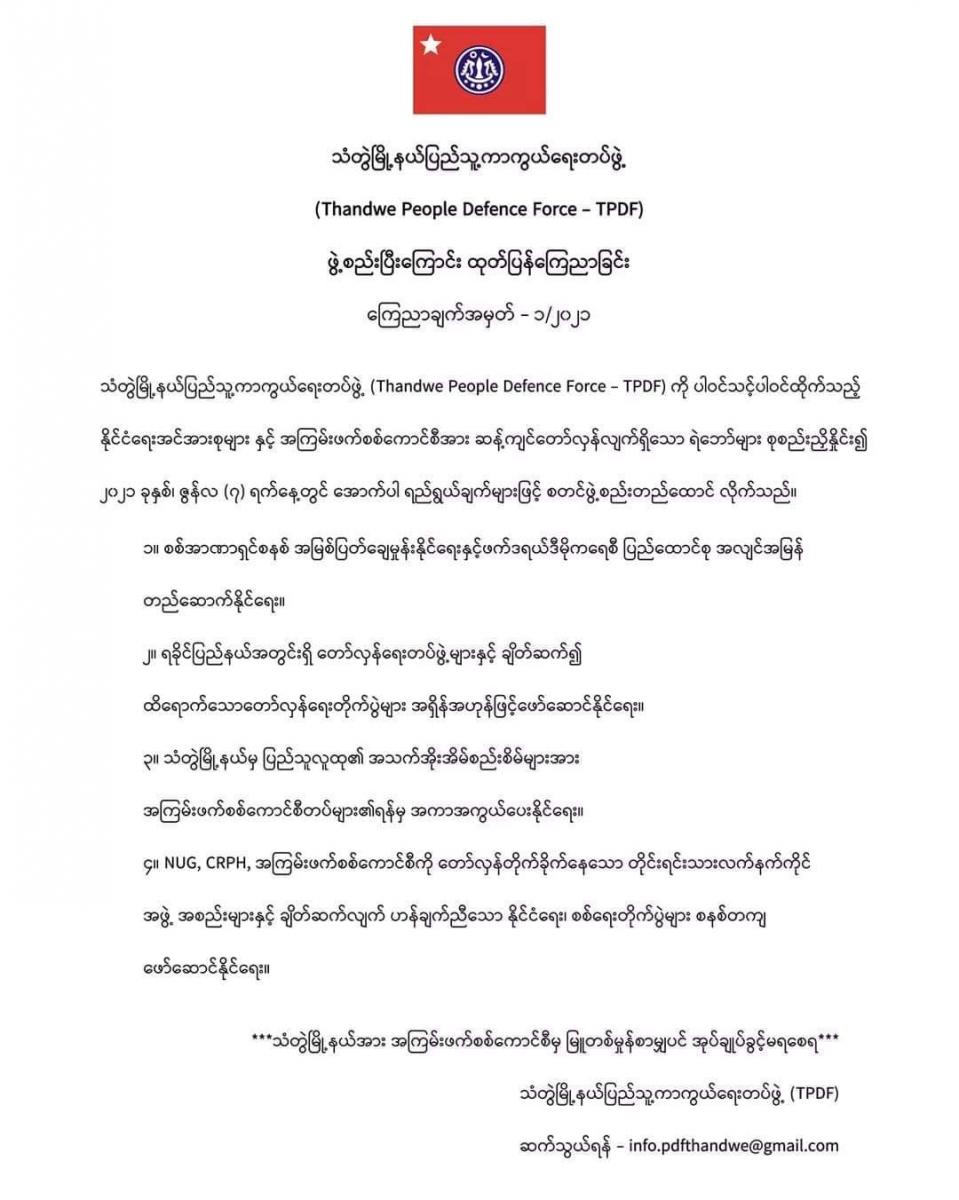 The statement mentioned that it was formed with four purposes, "To eradicate the Military Dictatorship and quickly establish a Federal Democratic Union, to carry out effective revolutionary clashes with other revolutionary forces in Rakhine State, to systematically protect the lives and property of the people in Thandwe Township and to organize military clashes systematically and a balanced politic by communicating with the Ethnic Armed Organization, CRPH, and NUG which are fighting against the Terrorist Military Council”.