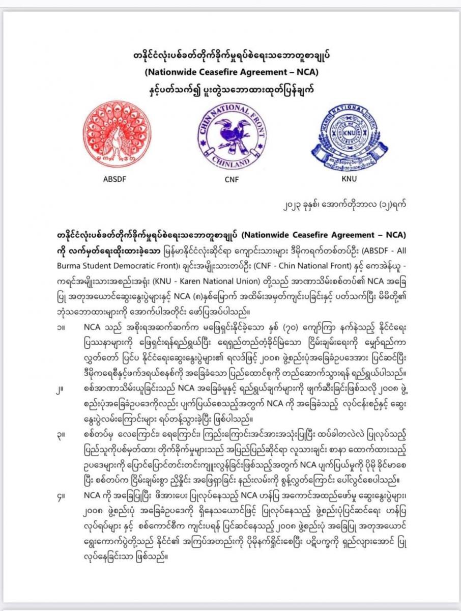 The Karen National Union (KNU), All Burma Students' Democratic Front (ABSDF), and Chin National Front (CNF), all signatories of the National Ceasefire Agreement (NCA), released a joint statement on October 12 timed as a response to the Junta’s invitation to Ethnic Armed Organisations (EAOs) to celebrate the NCA's 8th anniversary on October 15th.