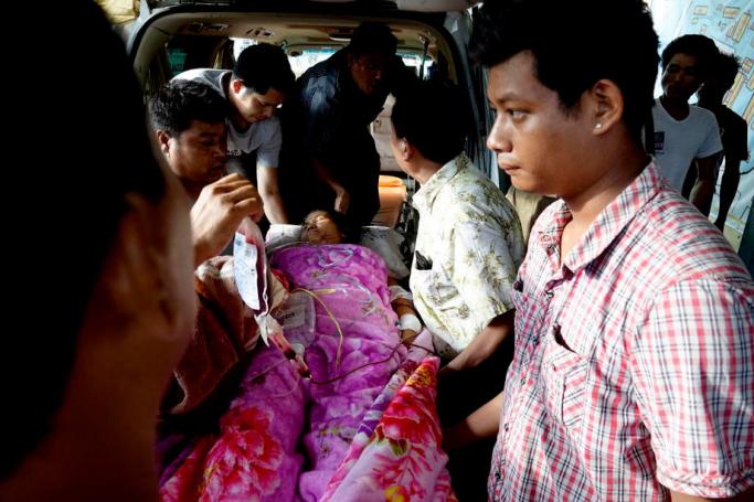 Rakhine Volunteers carry an injured Rakhine ethnic woman as they arrive to Sittwe Hospital in Sittwe, Rakhine State, Western Myanmar, 24 August 2019. According to reports, three people died and several others are injured after heavy weapons and bullets hit the houses in the village of Pyan Mraung near Min Bya township during clashes between the Myanmar military and the Arakan Army (AA) on 24 August. Photo: Nyunt Win/EPA
