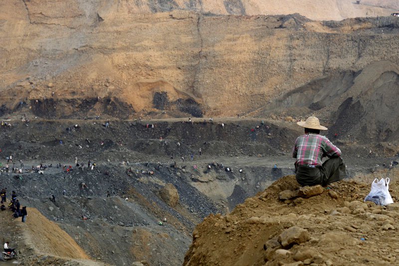 Miners search for jade stone near the heavy earth-excavators at the Hpa Kant jade mining area, Kachin State, northern Myanmar, 25 February 2017. Photo: La Min Tun/EPA