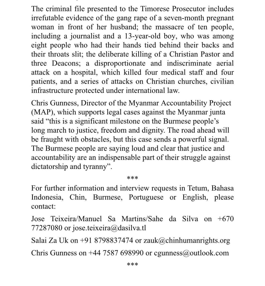 “The rule of law is a priority issue for Timor-Leste”, said Jose Teixeira, from the Timorese law firm Da Silva Teixeira & Associados Lda, representing CHRO. “And it is vital that the independence of the Timorese judiciary is respected and that the legal process runs its course. We firmly reject any outside interference, particularly from the Myanmar junta, in Timor-Leste’s court system,” he added.