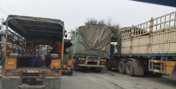 The line of vehicles stretched out of town from the border gate, creating difficulties for smaller cars navigating the town and leading to tension among drivers, eyewitnesses told SHAN.