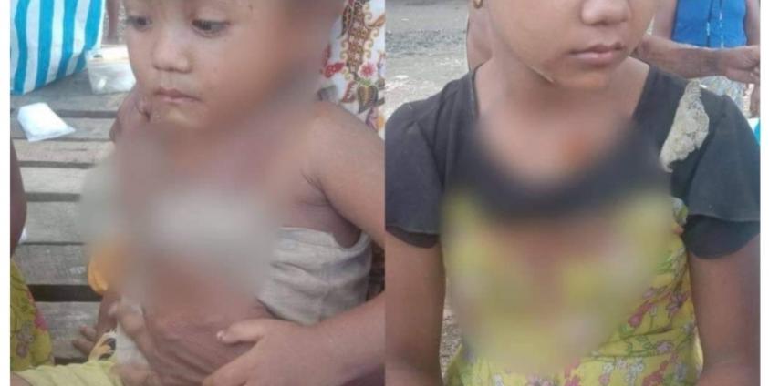 Two children in Moungswe village, Mrauk U Township, injured after being hit by shrapnel of an artillery shell are facing difficulties to access proper medical treatment for their wounds.