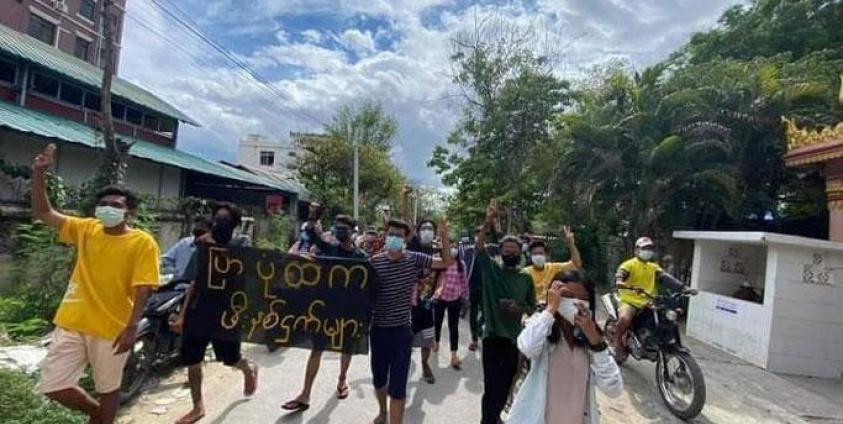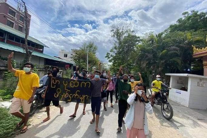 Two protesters were injured and two others were arrested when gunmen opened fire on a group of protesters called "Phoenixes in the Ashes" in Chan Mya Thar Si Township, Mandalay.