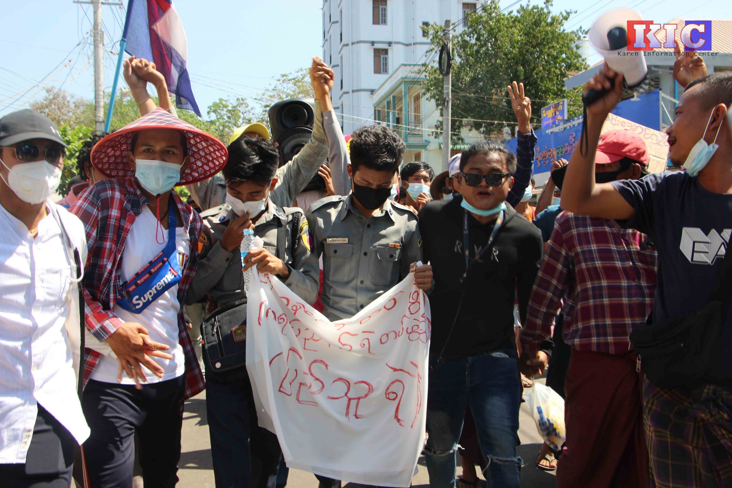 Two police members joined the 6thday of anti-coup protest in Hpa-An of Karen State on February 13th.The police members joined the protest after the protestors staged a sit-in protest from 9 am to 12 noon on east Kanthaya road in Hpa-An Township.