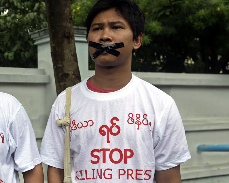 Reuters journalist Wa Lone wearing a t-shirt with a slogan reading, 'Stop killing press' and tapes on his mouth takes part in a protest over their jailed colleagues, near the Myanmar Peace Center in Yangon, 12 July 2014  (Photo: Nyein Chan Naing/EPA)