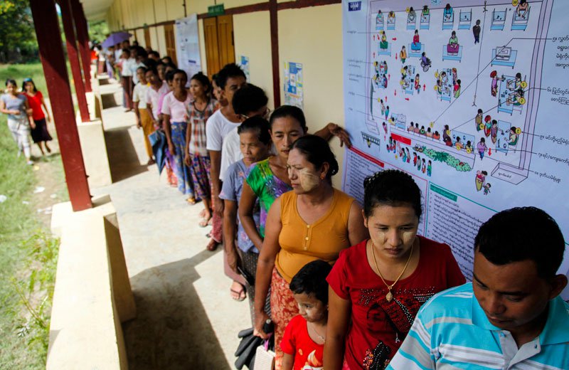 (File) People line up to cast their votes at a polling station in Sittwe, Rakhine State, western Myanmar, 08 November 2015. Photo: Nyunt Win/EPA