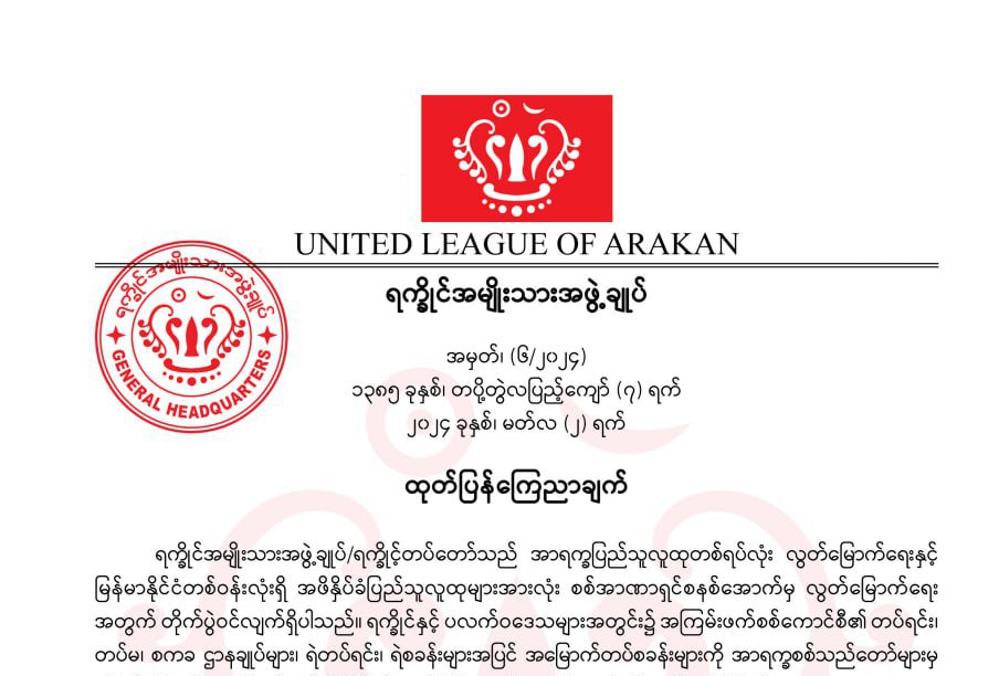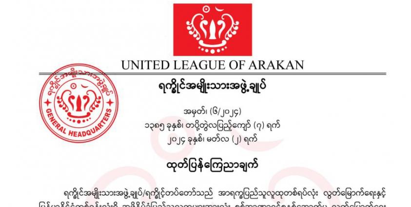 ULA warned that such actions would be perceived as hostile and confrontational towards the Arakan Army (AA), the armed wing of ULA, and could potentially result in a broader and undesirable escalation of bloodshed.