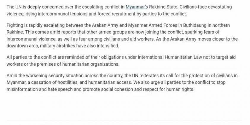 The United Nations expressed serious concern over the escalating conflict in Rakhine State of western Myanmar. In a statement  released on 9 May, the UN stated that as inter-communal tensions rise and forced recruitment continues, the local civilians in the Rakhine region face devastating violence.