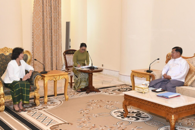 United Nations' new special envoy for Myanmar Noeleen Heyzer (L) talking with Myanmar military chief and Chairman of the State Administration Council Senior General Min Aung Hlaing (R) during their meeting in Naypyitaw, Myanmar, 17 August 2022. Photo: MNA