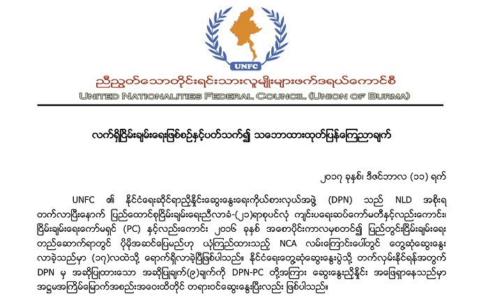 The United Nationalities Federal Council (UNFC) has requested an audience with State Counsellor Daw Aung San Suu Kyi and Tatmadaw Commander-in-Chief Senior General Min Aung Hlaing to discuss the outstanding demand, according to an announcement released by the ethnic bloc on December 11.