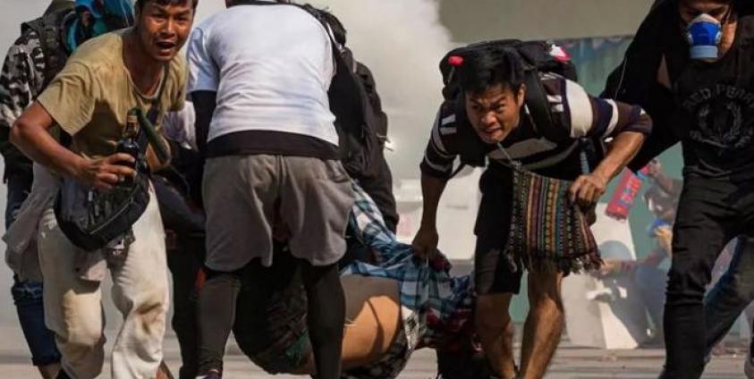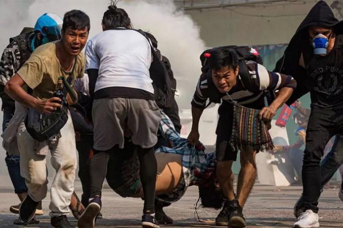 Photo: In this file photo taken on March 17, 2021 protesters carry a wounded man shot with live rounds by security forces during a crackdown on demonstrations against the military coup in Yangon. Photo: AFP