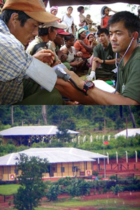 FBR medics providing treatment to Shan, Wa, Lahu, Lisu, Palaung and Pa'O villagers in Eastern Shan State (Photo:FBR) and Burma Army IB65 camp, close to Na Kawng Mu village, South of Mongton. (Photo:FBR) . Source:: S.H.A.N (30 July 2008)