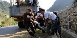 လောက်ကိုင်ဒေသမှ စစ်ရှောင်ဒုက္ခသည်များ တင်ဆောင်လာသည့် ယာဉ်တန်းမှ ကြက်ခြေနီ အလံလွှင့်တင်ထားသည့်...