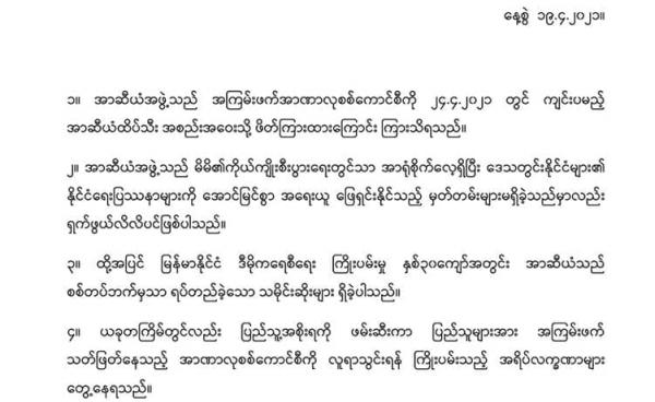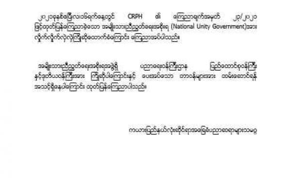 ပြည်ထောင်စုလွှတ်တော်ကိုယ်စားပြုကော်မတီ၏ ဦးဆောင်မှုဖြင့် ဖွဲ့စည်းလိုက်သည့် အမျိုးသားညီညွတ်ရေးအစိုးရ (NUG) အား ကြိုဆိုထောက်ခံကြောင်း...