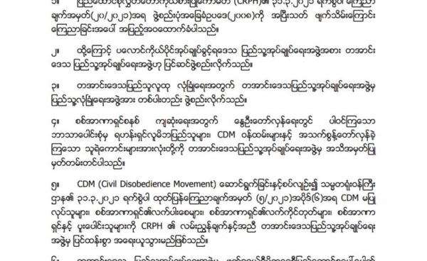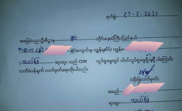 ချင်းပြည်နယ်၊ မတူပီမြို့နယ်အတွင်းရှိ ပညာရေးဝန်ထမ်းများကို CDM တွင်မပါဝင်ကြောင်း ခံဝန်ကတိများထိုးပြီးမှ ဝန်ထမ်းလစာထုတ်ပေးမည်ဖြစ်ဟု...