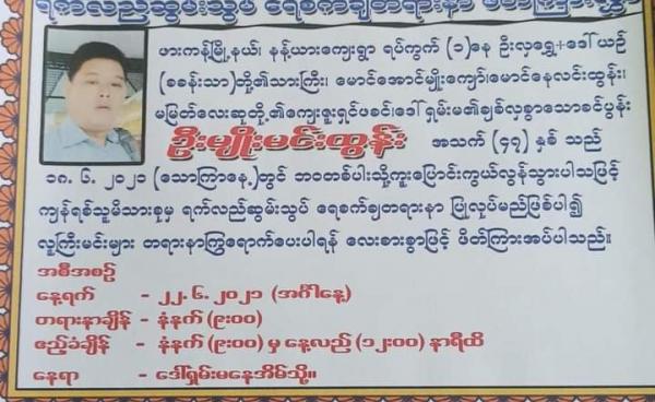 မွန်ပြည်နယ် သထုံမြို့နယ်ရှိ နောင်ဘိုကျေးရွာ အုပ်ချုပ်ရေးမှူးတစ်ဦး အမည်မသိသူနှစ်ဦး၏ သေနတ်ဖြင့်ပစ်ခတ်မှုကြောင့် သေဆုံးမှု ဇွန် ၂၁ ရက်က...