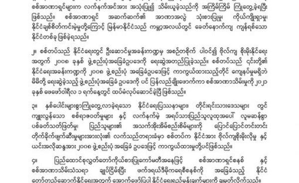 အချိုးကျကိုယ်စားပြုစနစ် (PR System) နှင့် စပ်လျဉ်း၍ စာတမ်းများပြုစုပေးပို့ရန် အာဏာသိမ်းစစ်ကောင်စီ၏ ရွေးကောက်ပွဲကော်မရှင်က စာရေးတောင်းဆိုထားမှုကို...