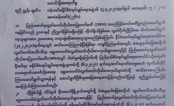 CRPH တွင် မပါဝင်ရန်နှင့် ပါဝင်ခြင်းမရှိကြောင်းကို ခရိုင်အုပ်ချုပ်ရေးအဖွဲ့ထံသို မတ် ၆ ရက်မတိုင်ခင် လူကိုယ်တိုင် လာရောက်သတင်းပို့ရန်ဟူသောစာကို...