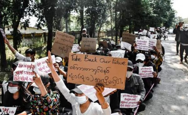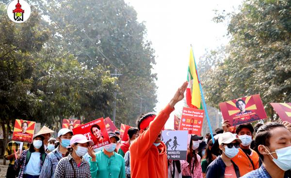 ဖော်ဖော်ဝါရီ ၂၂ ရက်ကပြုလုပ်ခဲ့သော နှစ်ငါးလုံးပြည်လုံးကျွတ်သပိတ်တွင် မိုးညှင်းမြို့၌ ဒေသခံ သိန်းချီပါ၀င်ခဲ့ပြီးနောက် ဆန္ဒပြသူဦးရေ...