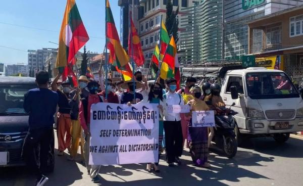 တပ်မတော်စစ်အာဏာသိမ်းမှု ဆန့်ကျင်ကန့်ကွက်သည့်အနေဖြင့် ရန်ကုန်မြို့ မြေနီကုန်း ပဒုမ္မာပန်းခြံရှေ့တွင် တိုင်းရင်းသားလူမျိူးပေါင်းစုံစုပေါင်း၍ ယနေ့ (...